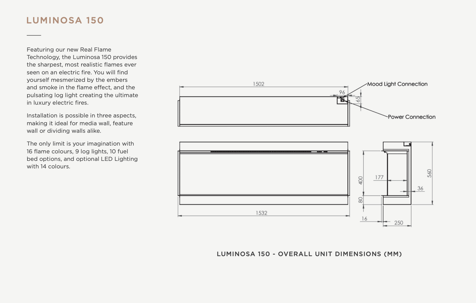 Compact & slim design – Built to save space, the Luminosa 150 benefits from a deep fuel bed yet packaged to be the shallowest electric fire of its kind, making it a space efficient option.