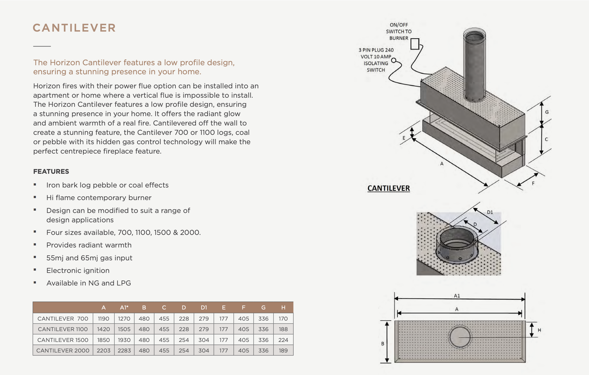 The Horizon Cantilever Open Gas Fireplace, with its power flue option, can be installed into apartments or homes where a vertical flue is not possible – offering greater flexibility without compromising on design. This impressive fireplace features a low-profile design, ensuring a stunning presence in any premium residential or commercial setting. The open gas flame offers a mesmerising visual experience, while the cantilevered firebox appears to float within the space, extending out from the wall and drawing the eye with its unique sculptural form.