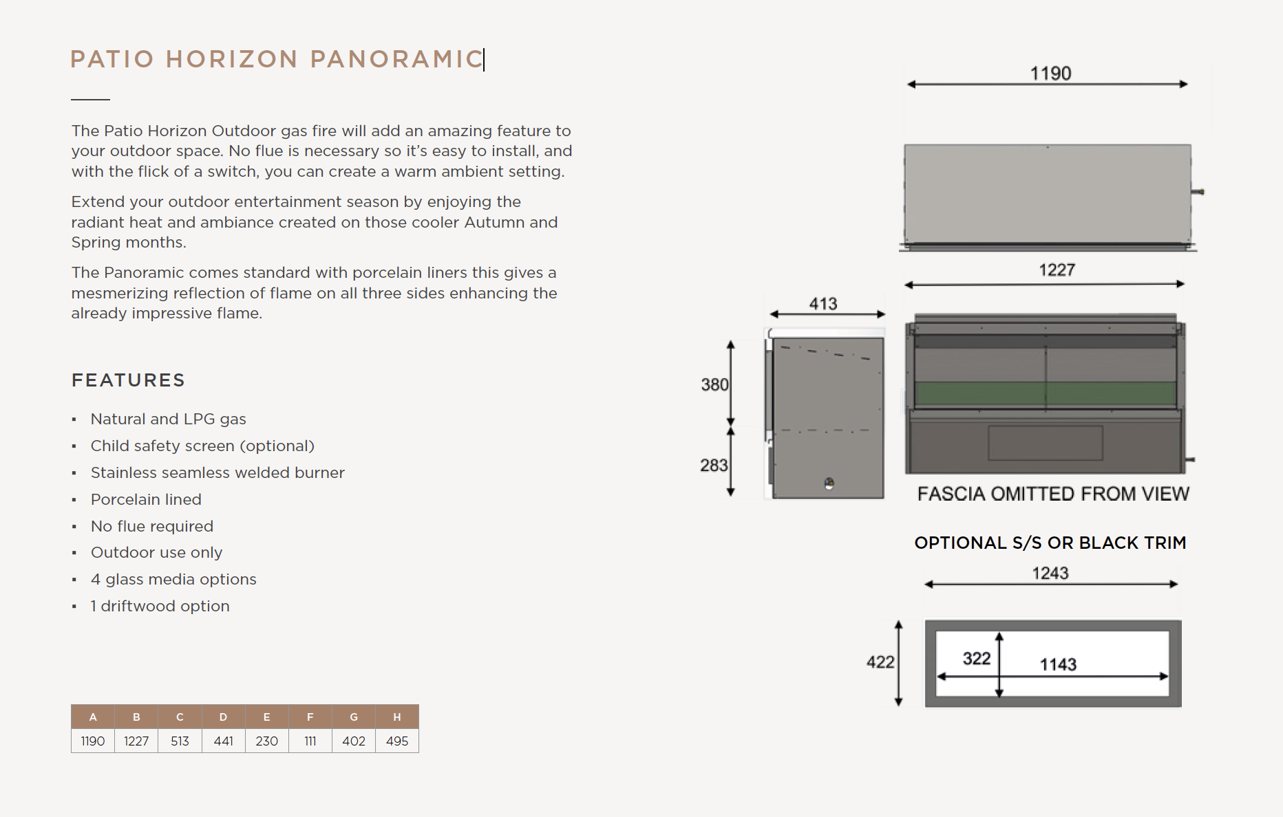 HORIZON PATIO PANORAMIC - OUTDOOR GAS FIREPLACE - Please Enquire for Pricing