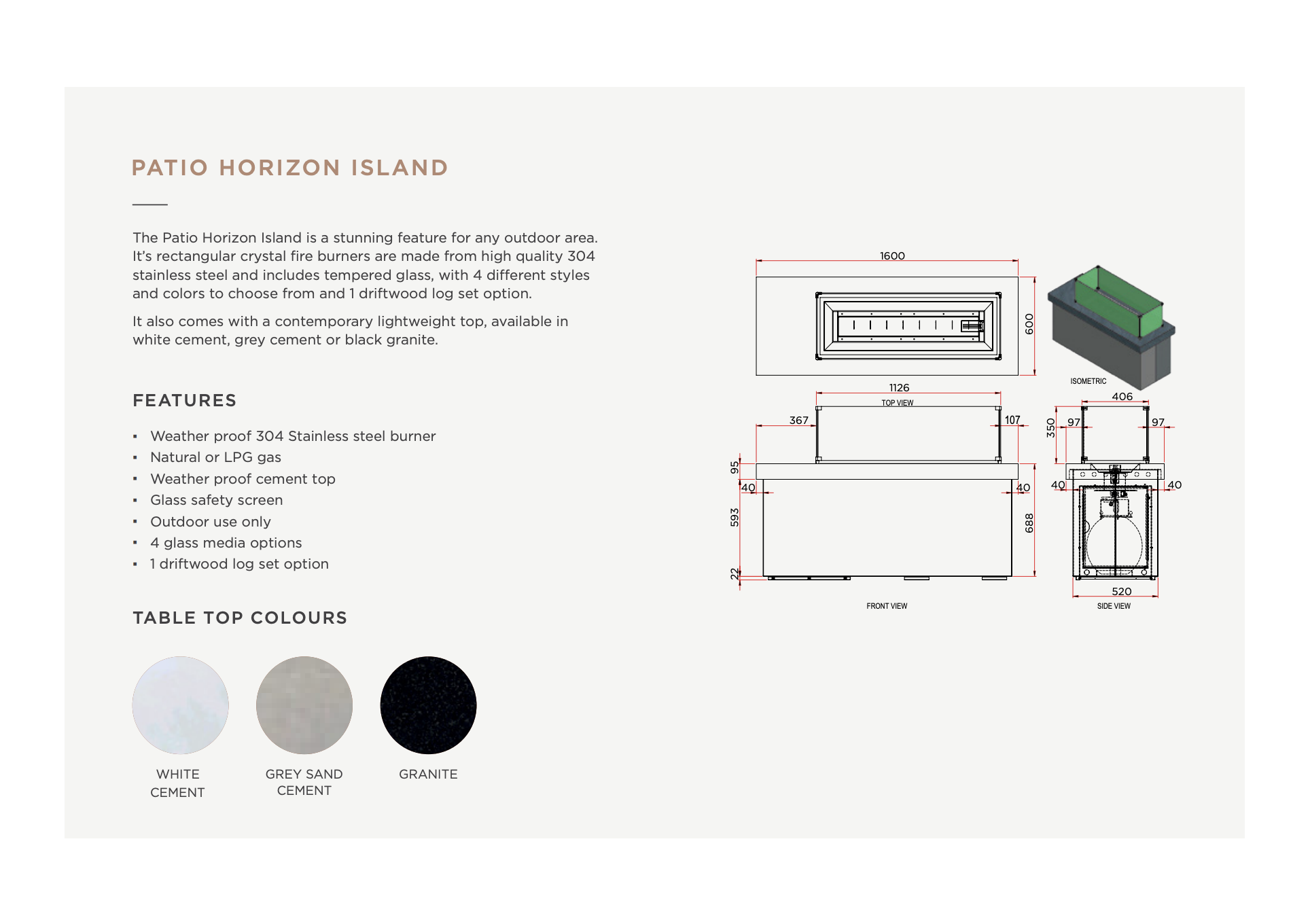 Introducing the Patio Horizon Island, a stunning outdoor feature that combines elegance with functionality. It’s rectangular crystal fire burners, crafted from high-quality 304 stainless steel, are complemented by tempered glass options in 4 styles and colours, along with a driftwood log set choice. The contemporary lightweight concrete top adds durability and modern appeal.