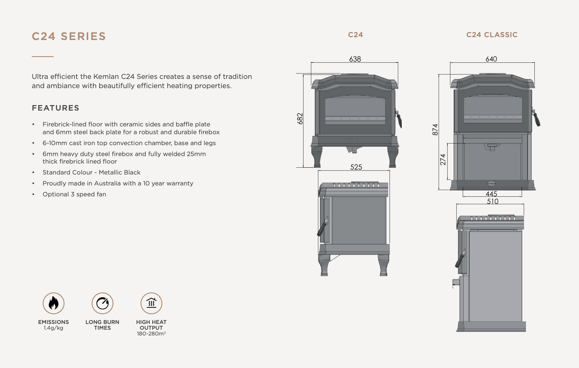 Due to the high temperature of the firebox, smoke is burnt as it rises towards the flue, making it remarkably clean burning. The Kemlan C24 boasts an impressive average of 1.4 gms/kg, vastly under the allowable Australian standard of 4.0gms/kg.