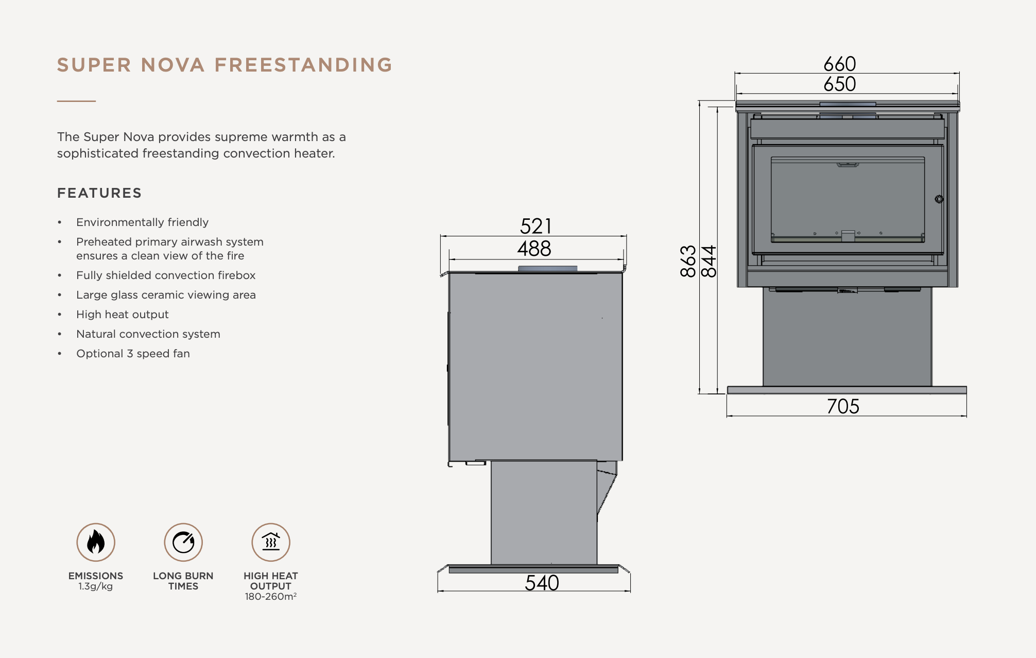 Built for both performance and environmental sustainability, the Super Nova includes a preheated primary airwash system that keeps the glass clean, offering a clear view of the flames at all times. The fully shielded convection firebox ensures optimal heat distribution, while the natural convection system circulates warmth throughout the space efficiently. For even more effective heat distribution, an optional 3-speed fan is available to further enhance air circulation.