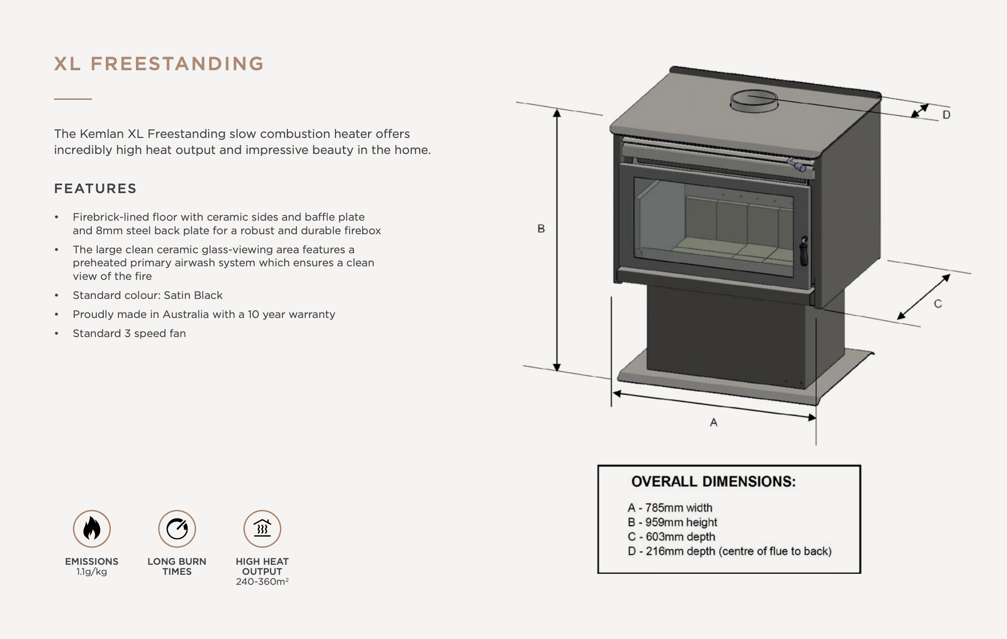 The Kemlan XL Freestanding Wood Heater combines rugged performance with sophisticated design, making it a stunning centrepiece for any home.