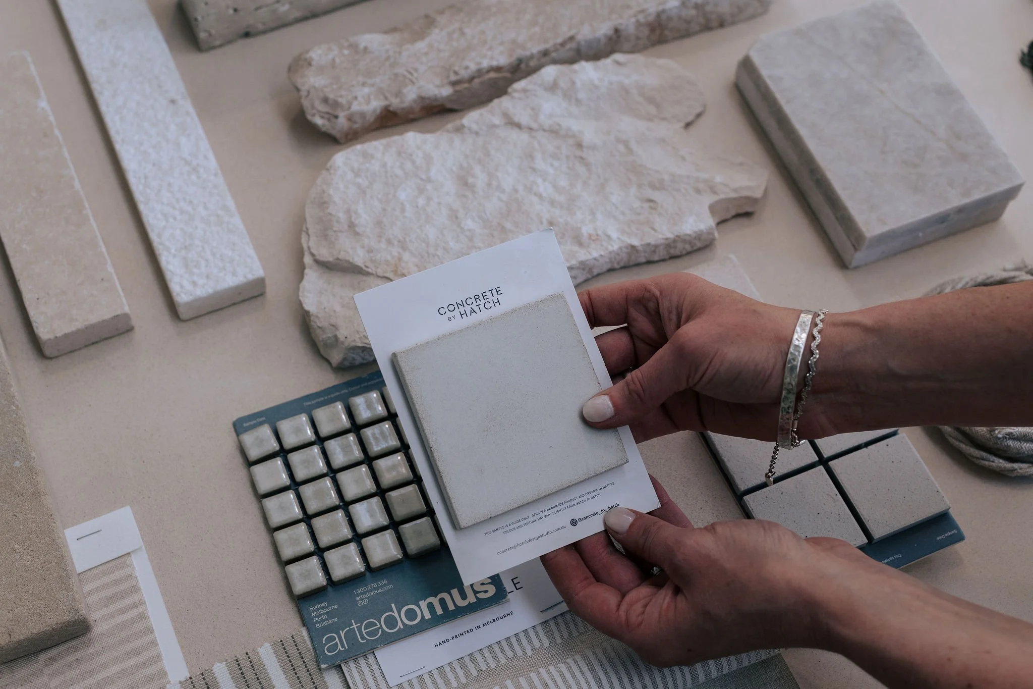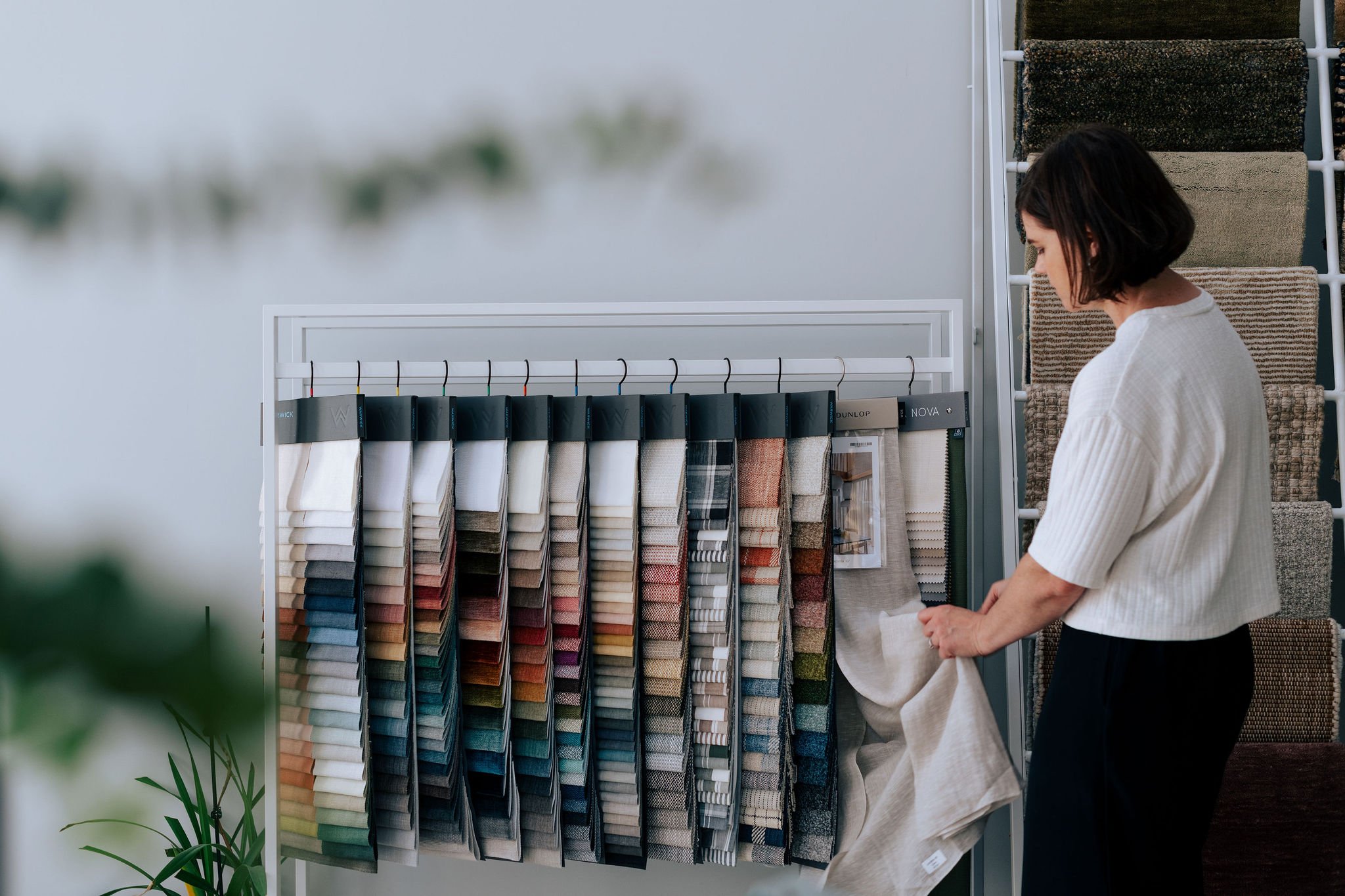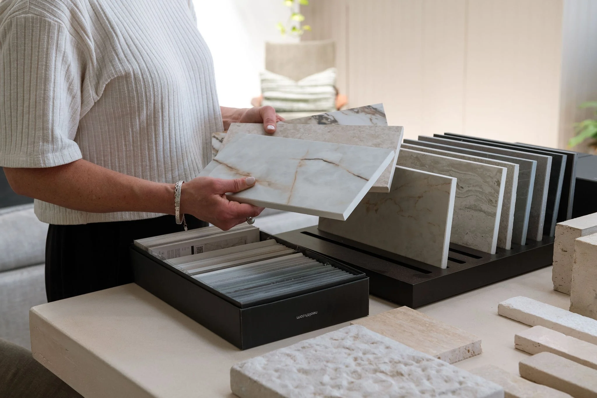 Our team brings extensive industry knowledge and access to a large sample library: upholstery fabrics, wallpapers, indoor and outdoor rugs, carpets, floorboards, ceramic and stone tiles, natural stone wall cladding, benchtops, cabinetry fronts and hardware, tapware, lighting, timber and MDF wall profiles, plaster finishes, paint colours, and more.